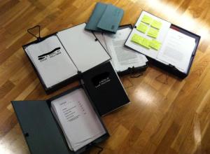 The post-it notes, stuck inside the lid of one of the boxes, contain chapter summaries. These notes were shuffled into different orders as the sequence of the chapters changed.